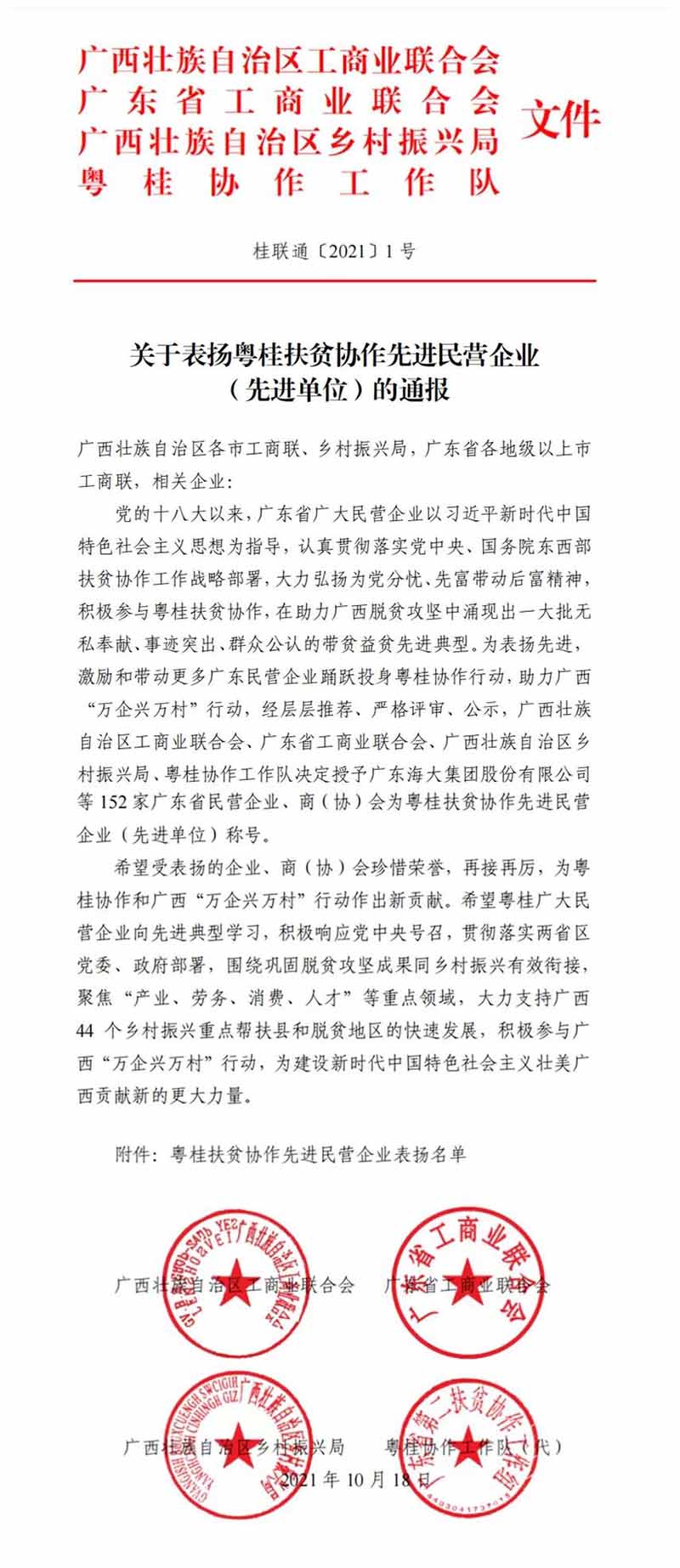 我司與其他151家企業(yè)、商協(xié)會被評為“粵桂扶貧協(xié)作先進(jìn)民營企業(yè)(先進(jìn)單位)”。