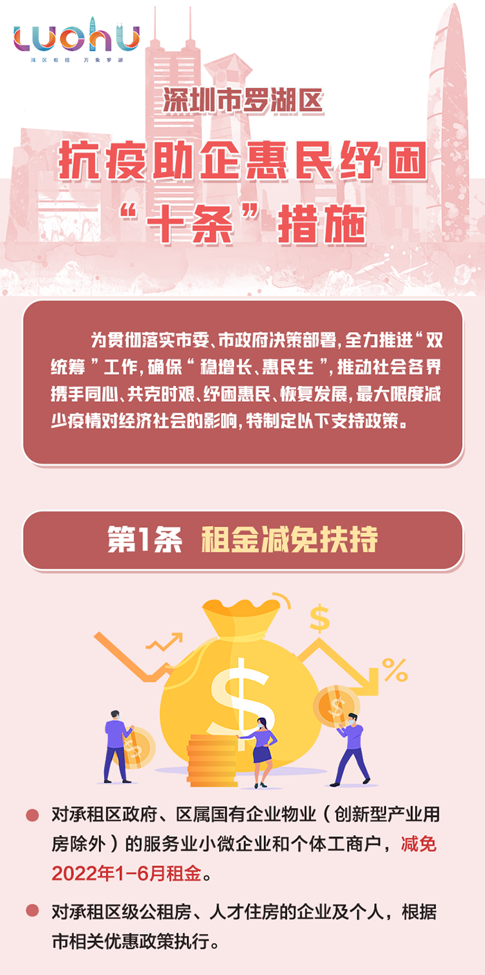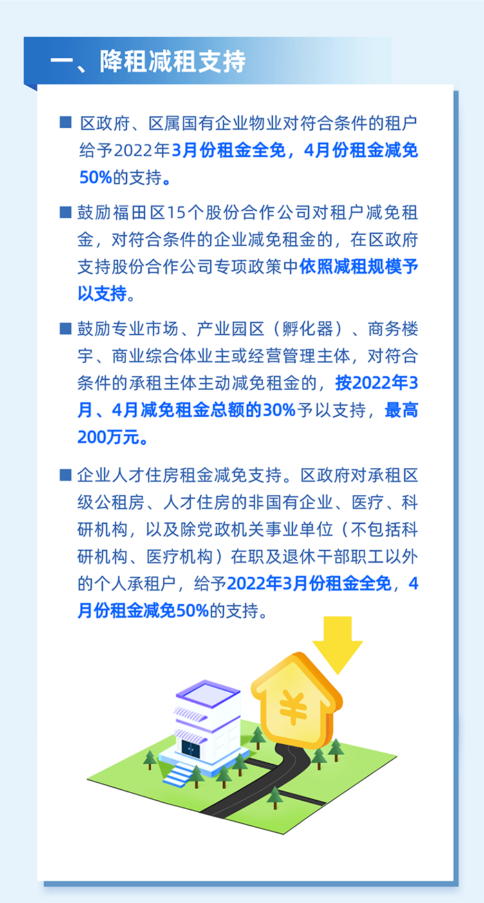 4.鼓勵寫字樓、商場、商業綜合體、專業園區等各類業主與租戶共克時艱,協商免租、減租、緩租。對南山區商業綜合體、購物中心、大型綜合性商業零售企業的經營管理主體符合條件的承租企業減免租金天數在半個月(含)以上的,按照2022年2月1日至3月31日期間減免租金總額的30%給予經營管理主體最高200萬元的資金支持。(責任單位:區工業和信息化局)