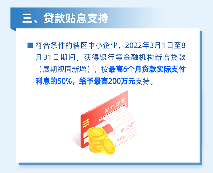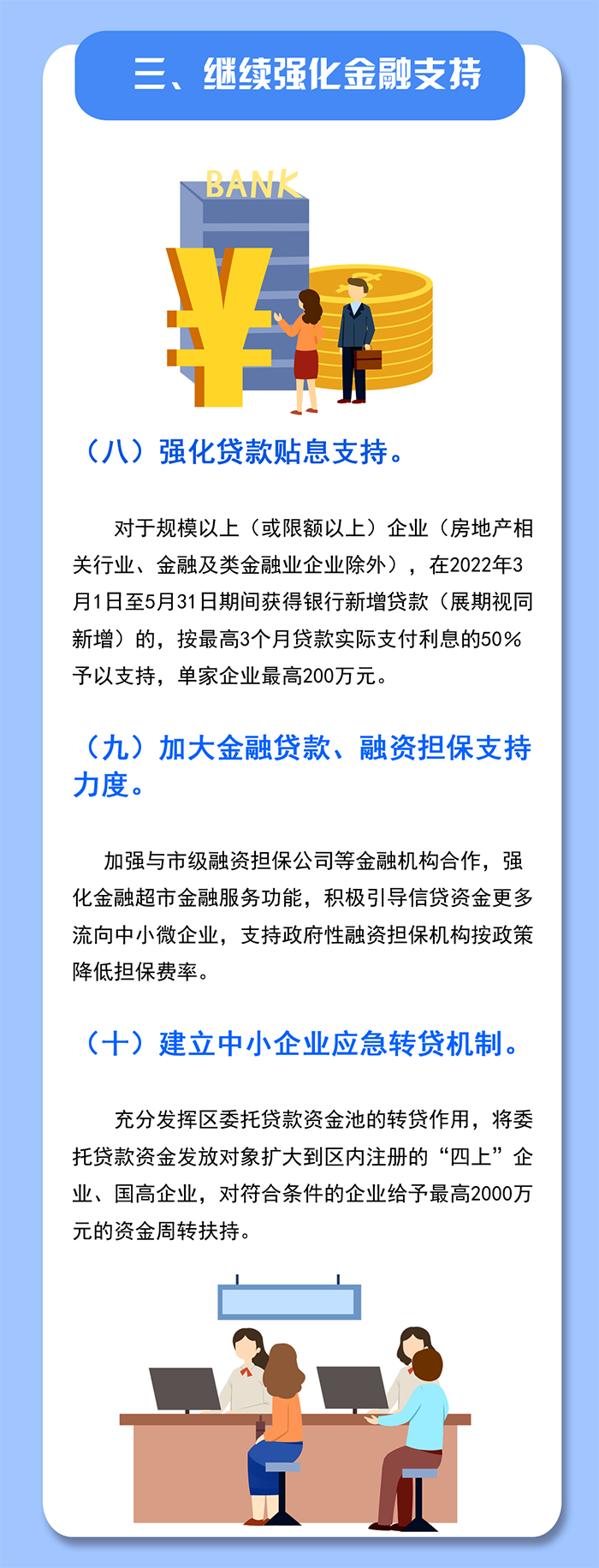 降低企業貸款成本。對2022年3月1日至5月31日期間,獲得轄區銀行等金融機構新增貸款(展期視同新增)的規模以上(或限額以上)企業(房地產及金融企業除外),按最高3個月貸款實際支付利息的50%予以支持,單家企業最高200萬元。(牽頭單位:區金融工作局)